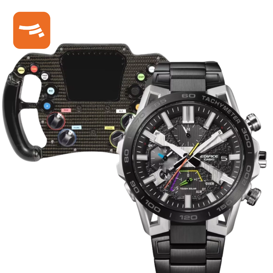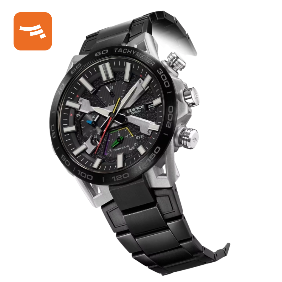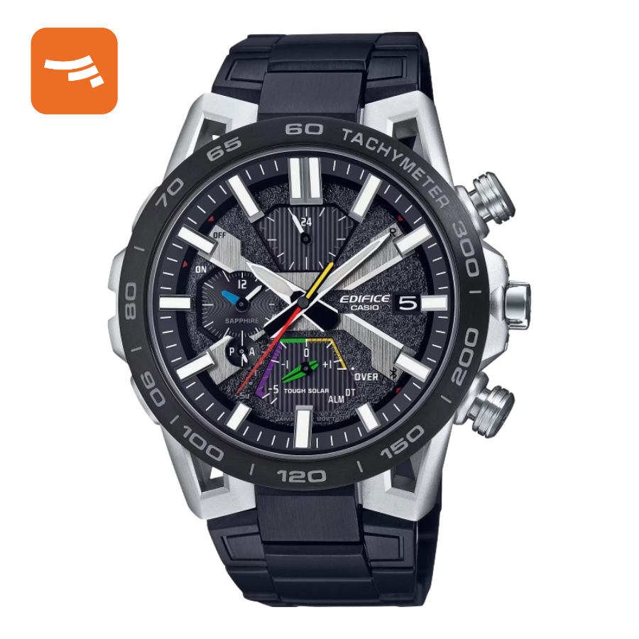 دارای قابلیت تاچیمتر Tachymeter آنالوگ: 3 عقربه شبتاب ساعت، دقیقه و ثانیهشمار (حرکت عقربه دقیقهشمار هر 10 ثانیه)- صفحه دارای چهار بخش برای نمایش ساعت به فرمت 24 ساعته، روز، نمایش همزمان دقیقه و ساعت