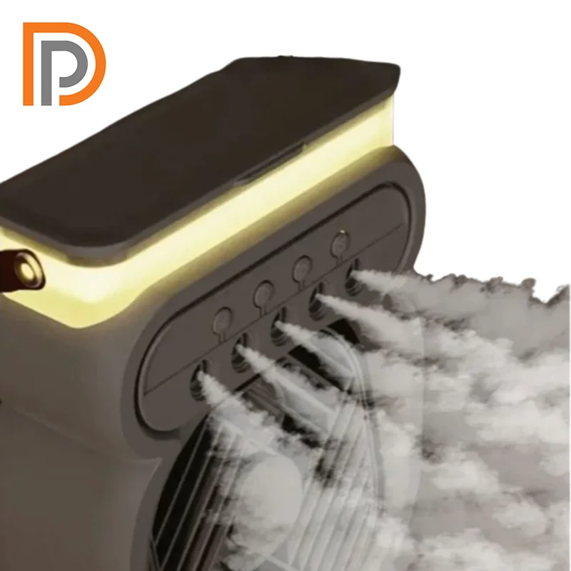 پنکه مه پاش رومیزی مدل Air Cooler Fan فاقد باتری است و به صورت مستقیم توسط آداپتور و کابل USB Type C به برق متصل میشود. دارای پنج نازل مه پاش قوی و قابلیت تنظیم تعداد مه پاش ها است. دارای پد خوشبو کننده و تایمر جهت خاموشی خودکار می باشد. فن دستگاه قابلیت تنظیم دستی و چرخش ۳۶۰ درجه در یک جهت را دارد و محافظ فن دارای قابلیت باز و بسته شدن جهت نظافت پره ها میباشد. ترجیحا از آب تصفیه شده درون دستگاه استفاده شود جهت جلوگیری از رسوب دارای چراغ LED با هفت رنگ دارای تایمر
